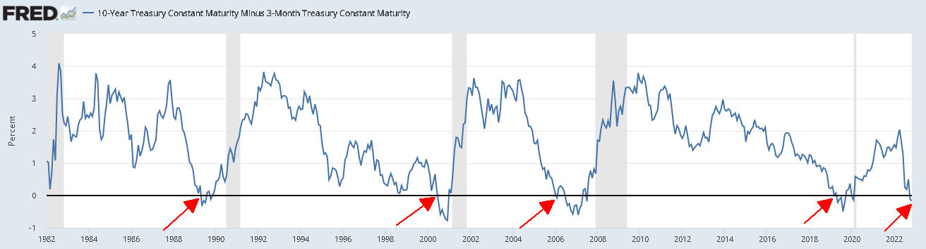 W październiku 2022r, krzywa rentowności obligacji 10 letnich i 3 miesięcznych uległa odwróceniu. Powszechnie uznaje się, że takie odwrócenie zapowiada nadchodzącą recesję w USA. Sprawdziłem momenty pierwszego odwrócenia krzywej (sygnał) i zachowania się indeksów giełdowych.