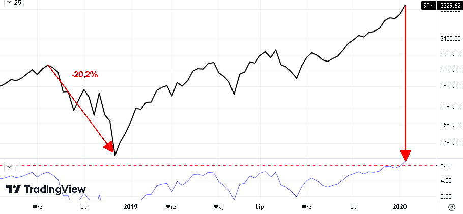 17 stycznia 2020r, na wykresie tygodniowym indeksu S&P 500, odchylenie od 40 tygodniowej wykładniczej średniej kroczącej przekroczyło wartość 8%. Było to pierwsze przekroczenie tej wartości po wcześniejszej korekcie ceny indeksu <= -15%. Tą sytuację uznaję za sygnał do poszukiwania podobnych momentów w historii tego indeksu.