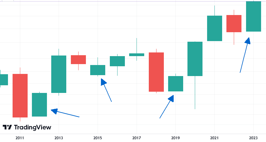 2023 rok, to pierwszy rok wzrostowy dla indeksu sWig80, po wcześniejszym roku spadkowym. Pierwszy rok wzrostowy traktuję jako sygnał. Poszukałem na wykresie podobnych historycznych sygnałów.