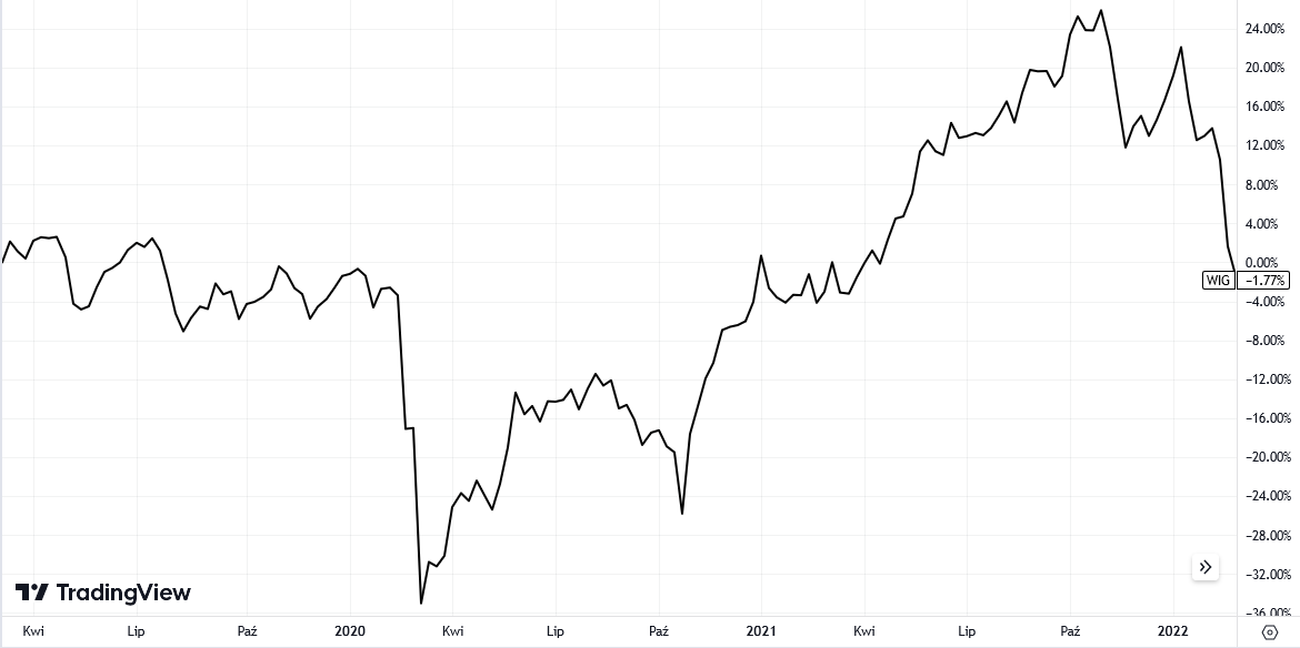 Ostatnie 3 lata na wykresie WIG i pierwsze wystąpienie ujemnej stopy zwrotu po wcześniejszej dodatniej
