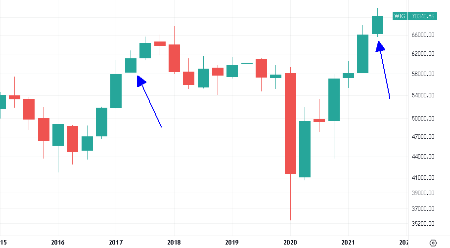Końcem września 2021r, na wykresie kwartalnym indeksu WIG, pojawiła się 4 z rzędu świeca wzrostowa. Takie sytuacje (zwane dalej sygnałami) w historii tego indeksu były bardzo rzadkie.